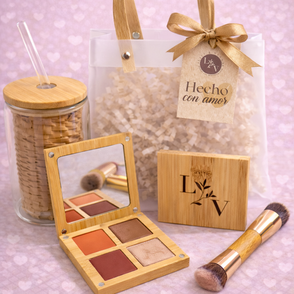 1- Paleta 4 en 1 con estuche de bambú con espejo ( recargable) Textura cremosa. 100% vegana